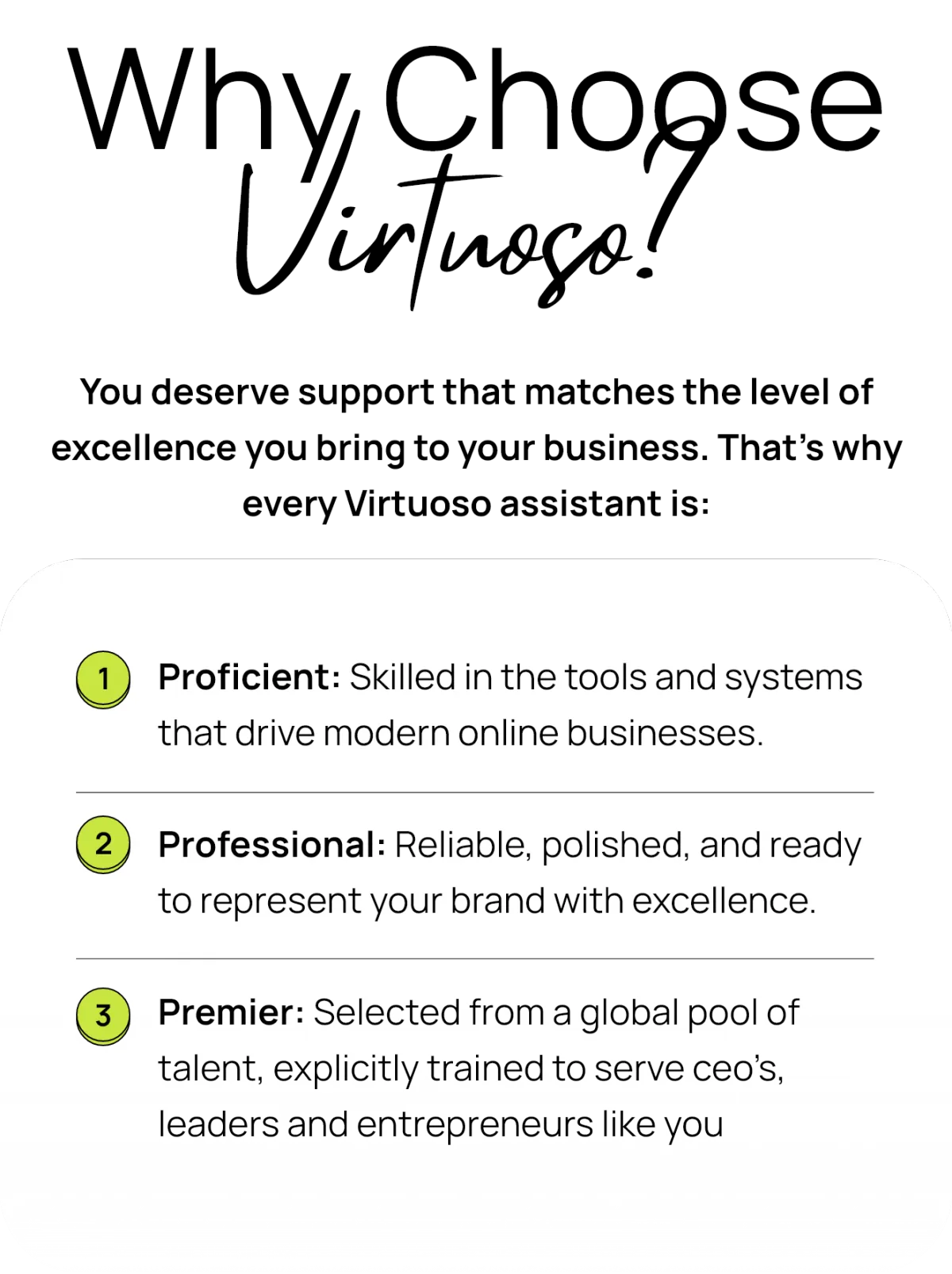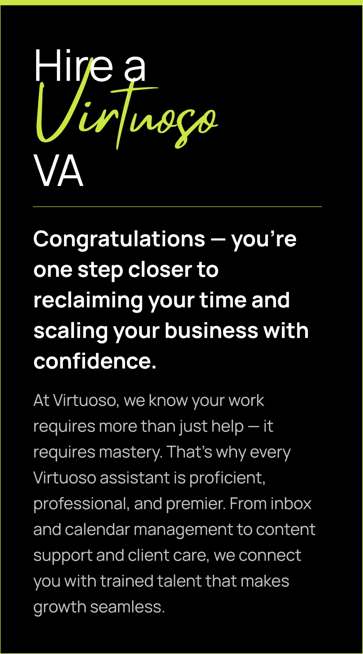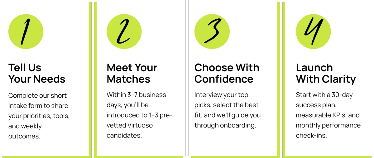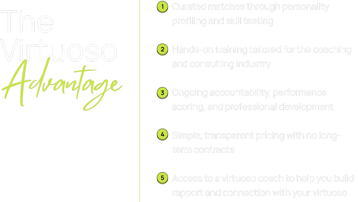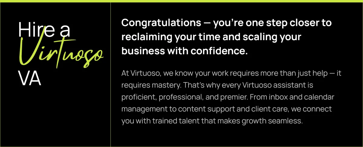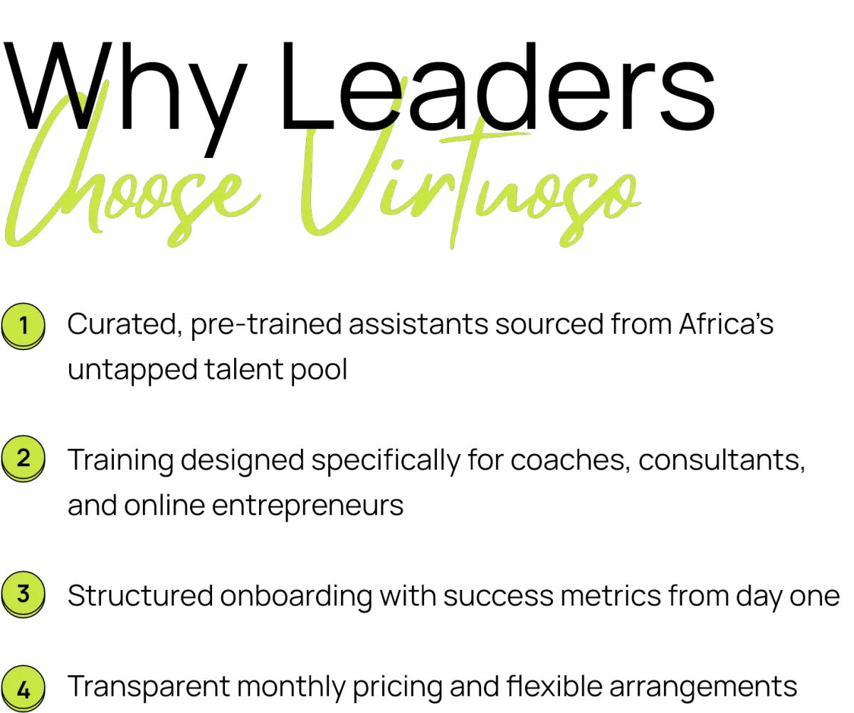 At Virtuoso, we don’t just provide assistants — we deliver excellence. Our trained executive admins and virtual assistants help coaches, consultants, and entrepreneurs reclaim their time, scale their businesses, and operate with confidence.