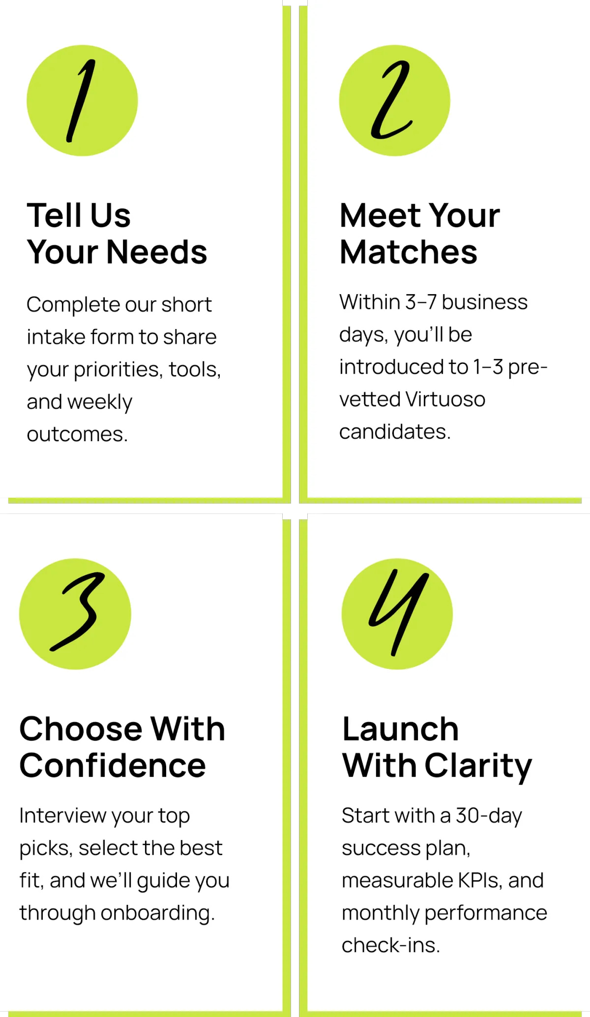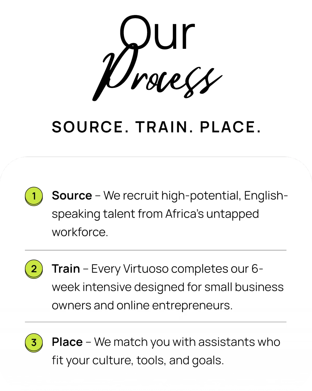 When you hire a Virtuoso, you’re not only scaling your business, you’re creating meaningful work opportunities in developing economies. By providing fair wages and global experience to assistants in Africa and Asia, you directly contribute to building stronger families and communities.
